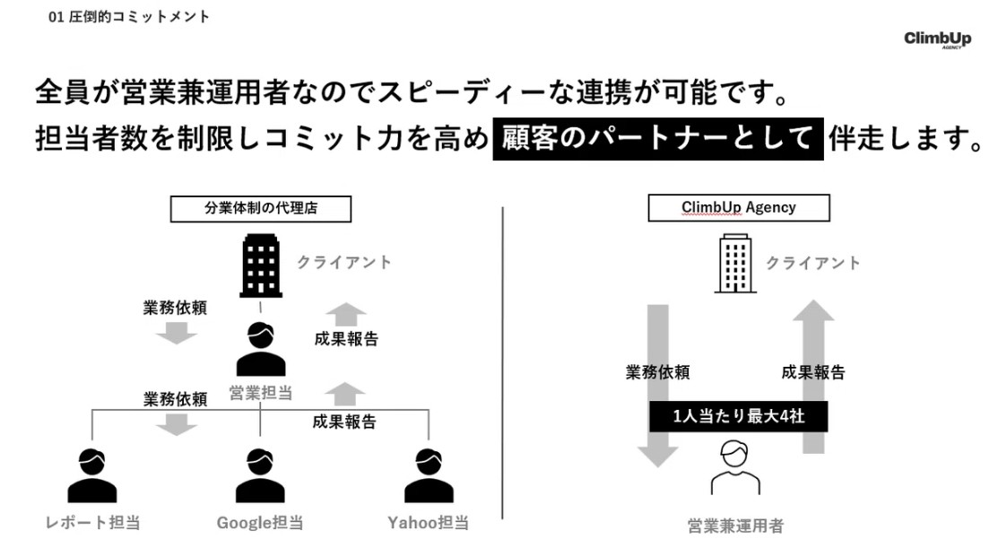 ClimbUp Agencyは、「運用者一人当たりの担当顧客数を最大4社」に制限しています。